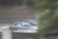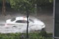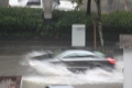 Shanghai Lujiazui CBD, typhoon shoot in hurricane winds. Business cars race to beat flooded streets. Difficult shoot conditions camera stabilizers do not work well, in such extreme wind.